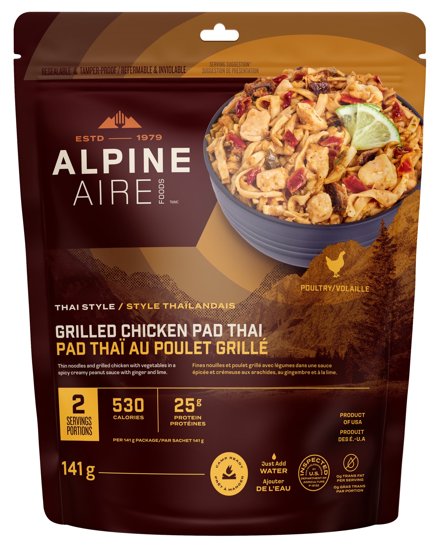 Ingredients: pasta ribbons (ground durum wheat semolina, water, salt), honey powder (honey, corn maltodextrin), freeze dried grilled chicken (chicken breast with rib meat, salt, potato starch, onion and garlic powder, spices), soy sauce [(fermented soybeans and salt), maltodextrin, salt], red & green bell peppers, potato starch, coconut milk powder (coconut milk, maltodextrin, sodium caseinate), peanut flour (peanut flour, defatted peanut flour, peanuts, roasted peanuts, roasted peanut flour, defatted peanuts), white onion, granulated garlic, champignon mushrooms, molasses powder (molasses, corn maltodextrin), garlic, ginger, white sesame seeds, shallots, white onion, sea salt, cilantro, monterey chili powder (chili pepper, spices, salt, garlic), crystallized lime (citric acid, lime oil, lime juice), crushed red pepper, green onion, green chile pepper, natural flavour (baker’s yeast extract, salt, canola oil)