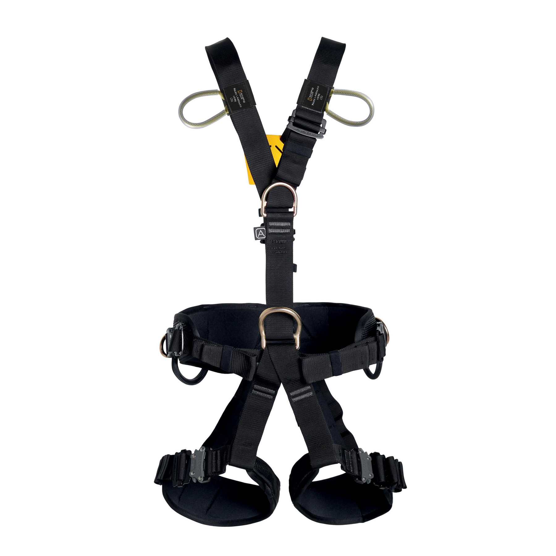 Fully adjustable full body harness for rope access, work positioning and fall arrest with SPEED buckles, steel components, fall indicator and connector keepers.
