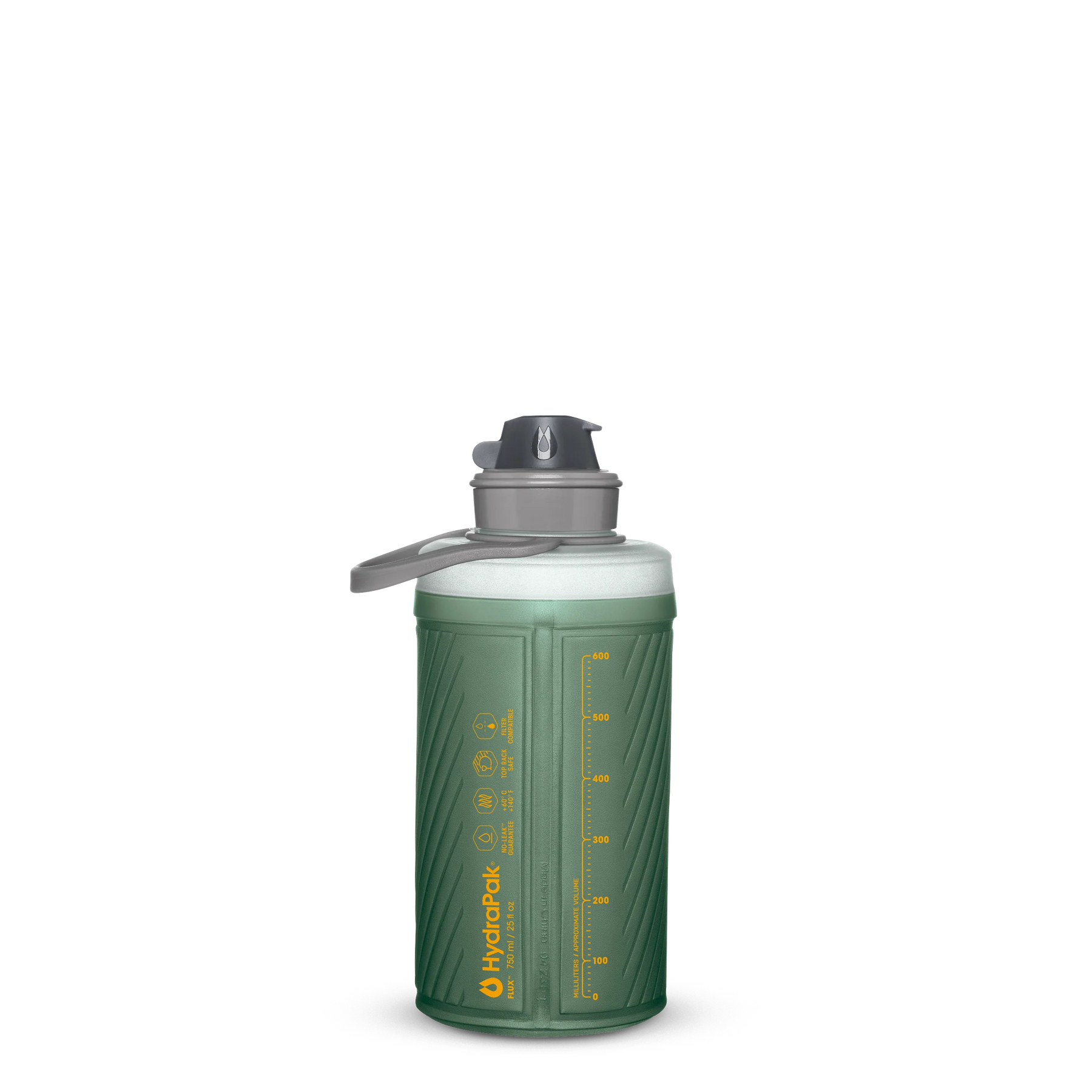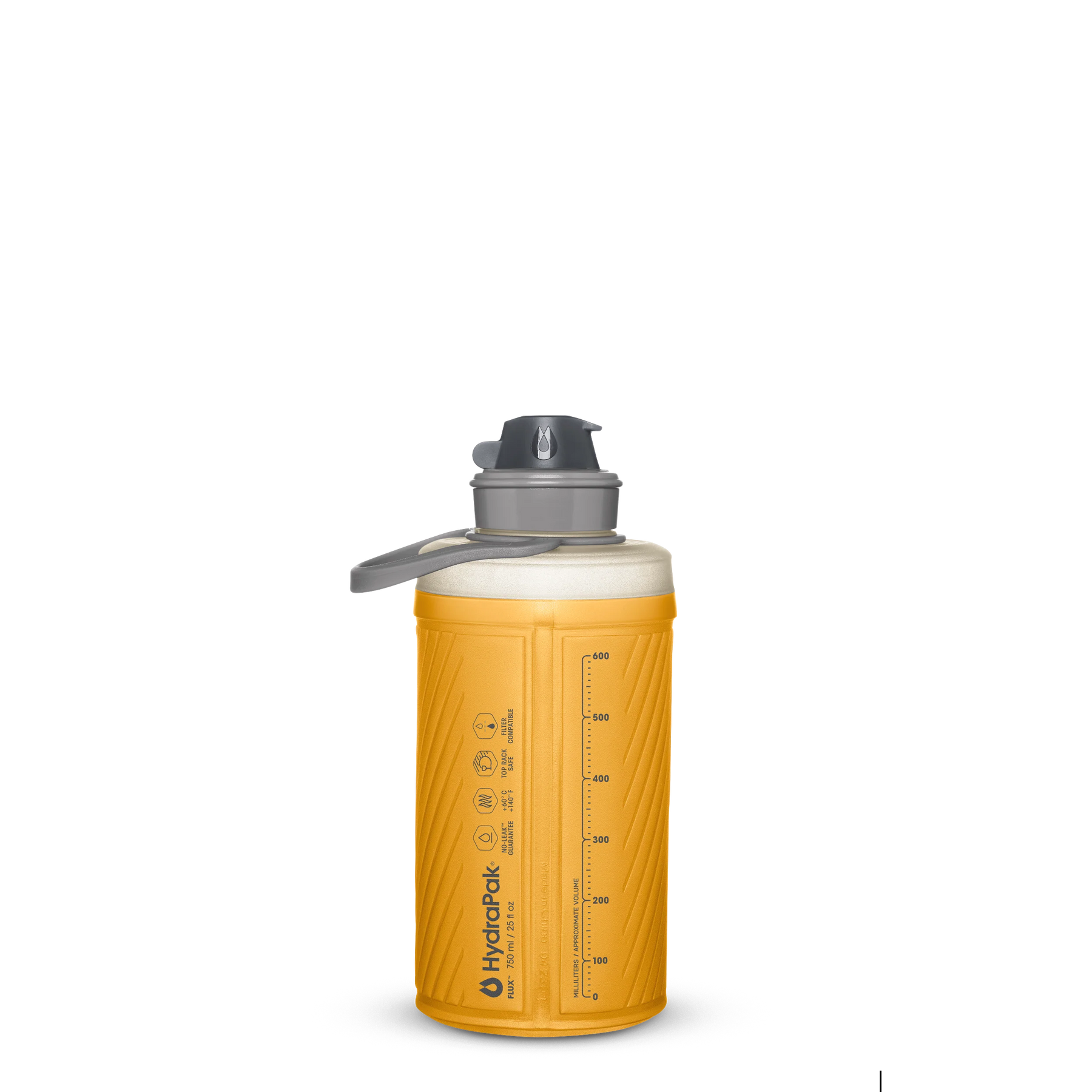 Flexible bottles get an upgrade. The Flux is shaped like a hard bottle, compresses like a softflask, and cuts weight by 50%. Topped with a dust cover and twist-drink nozzle for grab-and-go hydration, plus a bail handle to keep hydration secure in your hand or on your pack. The Flux stands upright like a hard bottle but when you finish your drink, this bottle packs down to pocket size.
